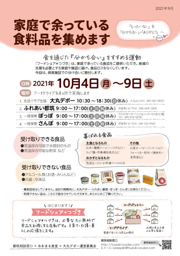 『フードシェア*つづき』は、家庭で余っている食品をご提供いただき、地域の支援を必要とする家庭や施設に届け、食品ロスをなくしています。